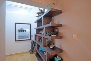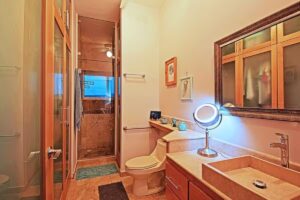 Fully Equipped: It features key stainless steel appliances, including a full-sized refrigerator and a cooktop integrated into the bar. You’ll also find a built-in oven and a practical microwave.