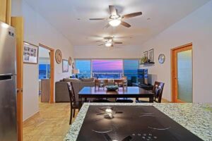 This penthouse is designed to make you feel connected, comfortable, and most importantly, amazed. Our main living area combines the living room, dining room, and kitchen into an open-concept space, offering the perfect place to enjoy and unwind.