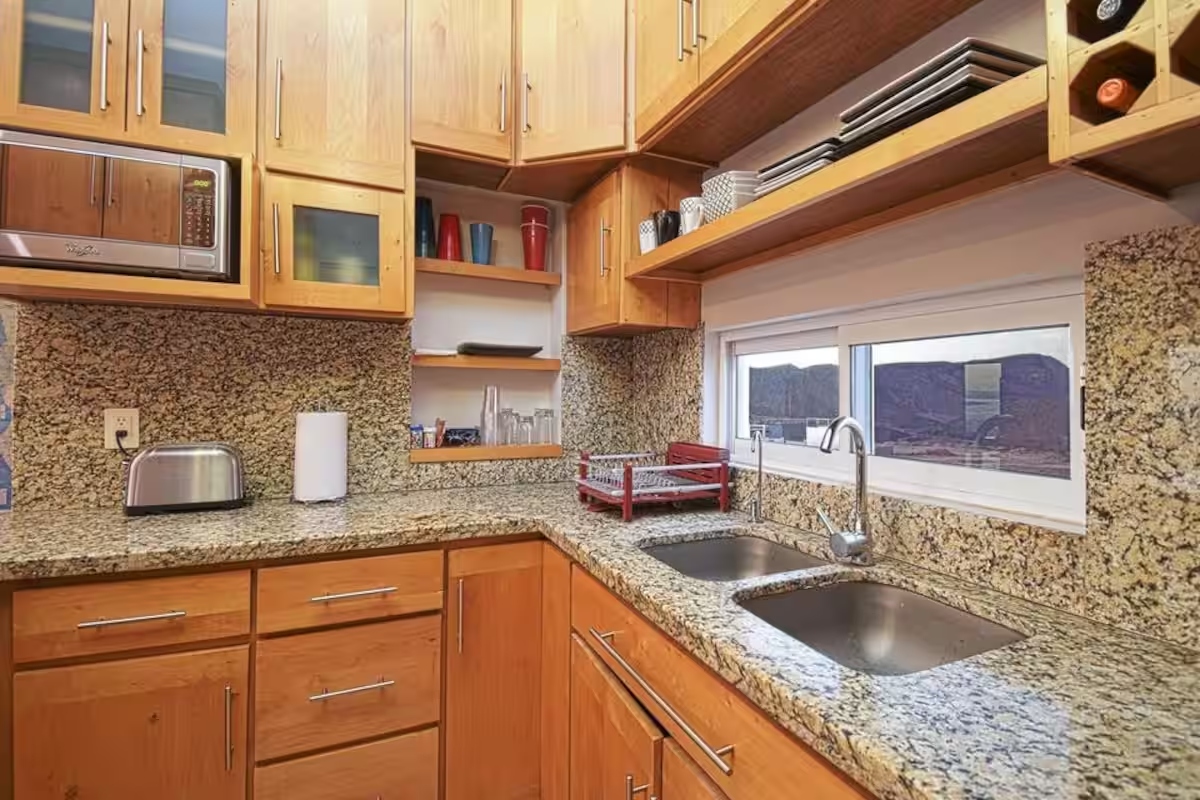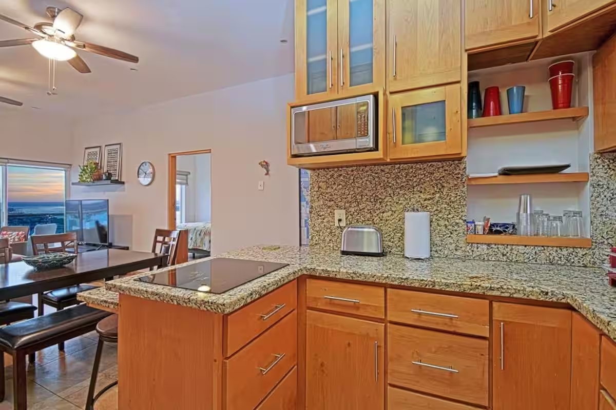 Fully Equipped: It features key stainless steel appliances, including a full-sized refrigerator and a cooktop integrated into the bar. You’ll also find a built-in oven and a practical microwave.